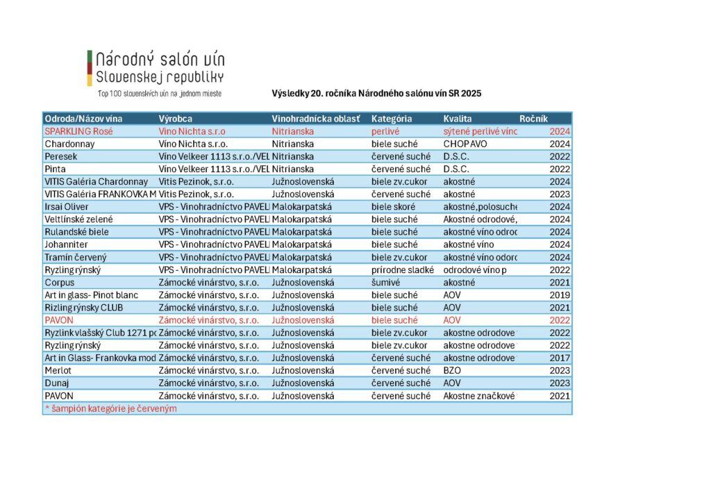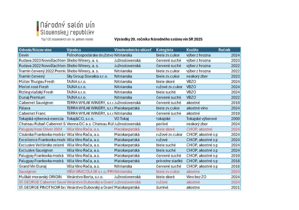 (Doľany, 18. september 2025) – Národný salón vín Slovenskej republiky, kolekcia 100 top slovenských vín, v jubilejnom 20. ročníku jesenného kola najvyššej slovenskej súťaže na hodnotenie vín novú kolekciu 75 vín, ktorá spolu s jarným kolom vytvára ucelenú kolekciu 100 najlepších slovenských vín. Verejnosť ich môže celý rok ochutnávať v priestoroch Apponyiho paláca v Bratislave. Do Národného salónu vín sa vína vyberajú v dvoch kolách. V jarnom kole sa počas odbornej degustácie vyselektuje 25 vín z kategórií – šumivé, perlivé vína a tiché vína z bielych skorých odrôd a ružových vín. V druhom kole jesenného hodnotenia kolekciu doplní 75 vín vrátane prírodne sladkých, červených a tokajských.