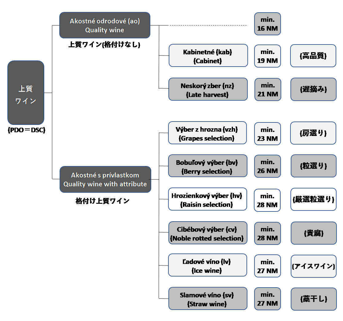 1993年のスロバキア建国時は今よりもより冷涼な土地であり、栽培時に葡萄を間引く事も無く、酸度の高い葡萄を大量に収穫し補糖を行っていた歴史から、1996年に収穫時の葡萄の糖度で格付けを行うドイツ的なワイン法が施行された。糖度の単位はスロバキア独特の単位でNMNormalizovaný muštomer)である。これは、マストメーター(糖度を図る器具)を使って数値化したもの。
